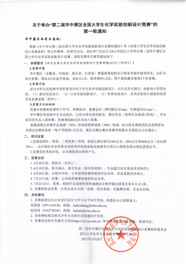 2.6月10日前:报名确认、提交作品(报告和视频),作品提交要求详见附件2《第二届华中赛区全国大学生化学创新实验竞赛(第一轮通知盖章扫描版)》。