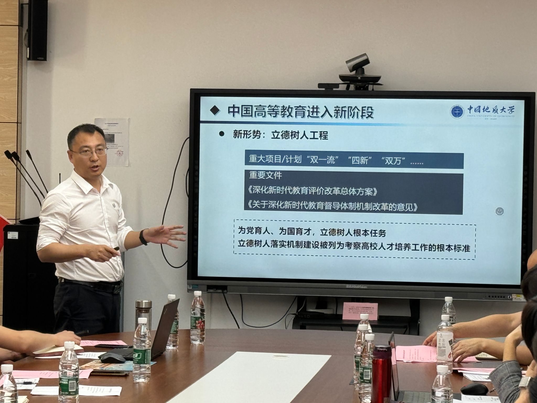 副院长靳洪允介绍本次本科教学教育审核评估的工作背景,详细讲解了本科专业设置调整优化管理办法,分解审核评估指标体系,梳理并细化审核评估学院工作组的各项工作任务和日程安排,对评估报告撰写基本情况进行介绍并提出要求。