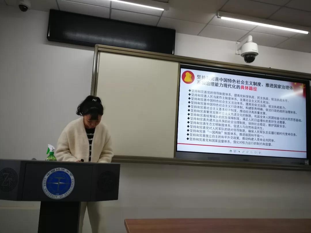 随后,由冯雨欣同志和石璐瑶同志带领支部党员一起学习党的十九届四中全会精神。他们主要从“会议总览”、“中国特色社会主义制度和国家治理体系的显著优势”、“坚持完善中国特色社会主义制度、推进国家治理体系和治理能力现代化的总体目标”、“坚持完善中国特色社会主义制度、推进国家治理体系和治理能力现代化的具体路径”四个方面带领大家学习了十九届四中全会的重点内容。会后,他们提供了PPT供支部党员继续深入学习。