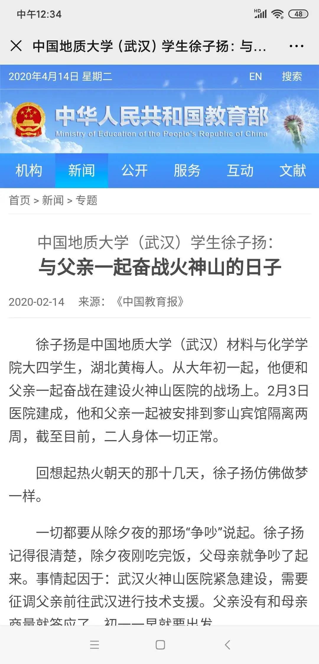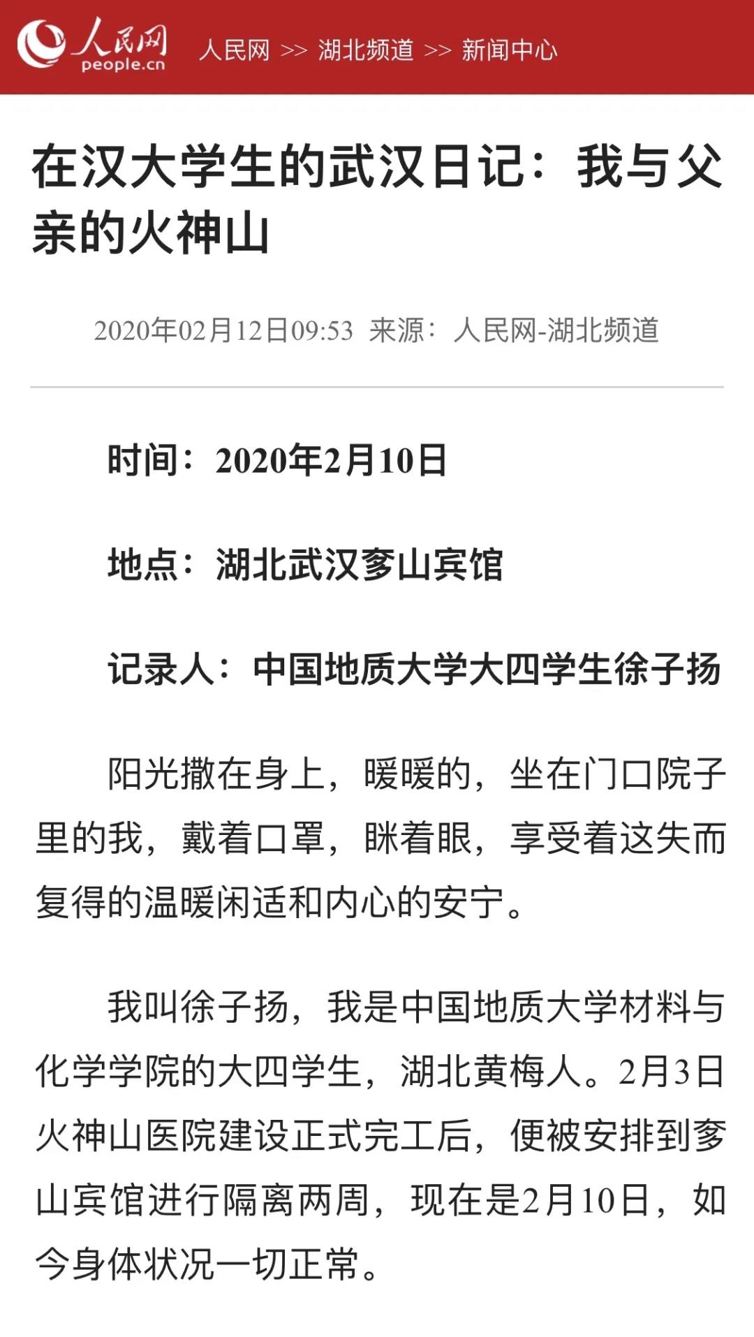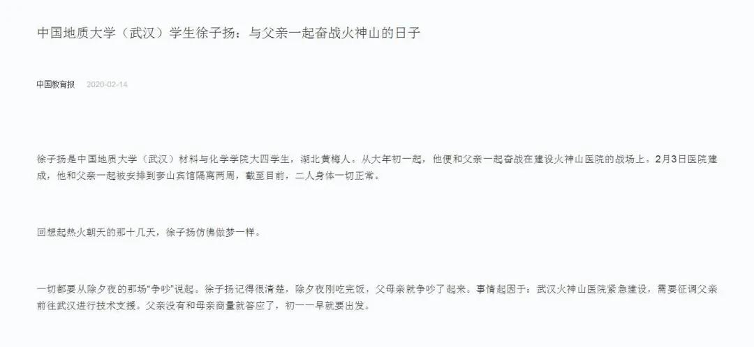 徐子扬同学于2020年1月25日奔赴武汉,连续10天全程参与火神山医院建设。前后共历时29天,他完成了一名普通学生向有为青年的转变,谱写了当代青年与祖国同呼吸、共命运的青春之歌。