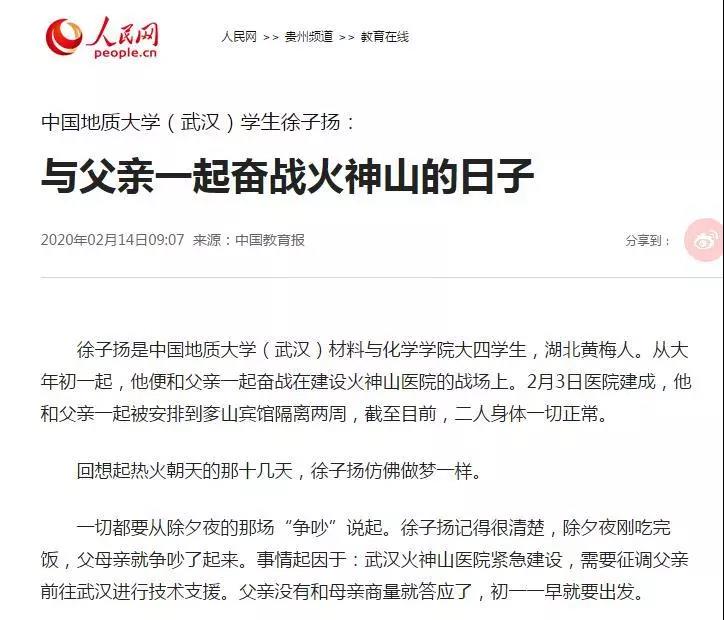 除夕夜,徐子扬一家刚刚吃过年夜饭,父亲告诉一家人,武汉火神山医院紧急建设,公司征调他进行技术支援,明天一早就出发。听说父亲要去武汉,徐子扬内心非常纠结:母亲乳腺癌晚期正在化疗,3岁的妹妹也需要人照顾,父亲是家里的顶梁柱,万一去武汉感染上病毒,后果不堪设想。可是国事前无家事,最终徐子扬决定让妈妈和妹妹先去大伯家,自己随同父亲一起前往武汉支援火神山医院建设,彼此之间也好有个照应。第二天早上8点,父子二人从黄冈市黄梅县的家里出发奔赴火神山施工现场。