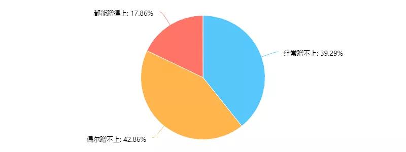 除了“小通勤+地铁”,我们还发现,有接近60%的同学有“蹭”教师大通勤的经历,说明大通勤对同学们还是很有吸引力的。而与此相悖的是,有约40%的同学表示经常“蹭”不上教师大通勤,仅仅有17.86%的同学表示都能“蹭”得上教师大通勤(如图所示)。