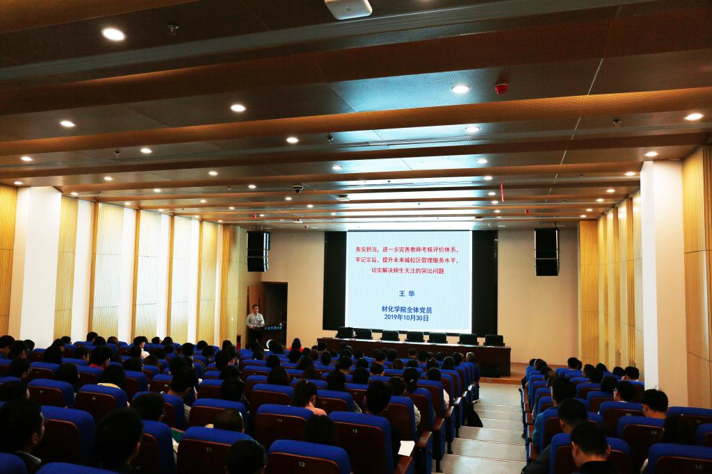 (通讯员:陈文婷)10月30日,学校党委常委、副校长王华以《务实担当,进一步完善教师考核评价体系,牢记宗旨,提升未来城校区管理服务水平,切实解决师生关注的突出问题》为题,在未来城校区科教五楼110报告厅为材化学院师生党员讲党课。本次党课由学院党委书记黄菊主持。