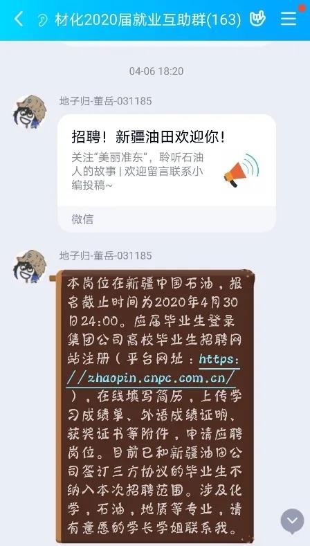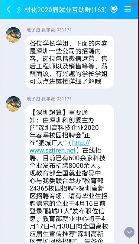 活动期间,采取一对一责任制,一名社团成员就是一座桥梁。在每个校友群安排一名社团成员作为负责人,收集校友们分享的招聘信息,并及时分类、汇总,转发到毕业生就业互助群中供毕业生选择。如有毕业生有意向,社团成员会做好毕业生和校友之间的沟通桥梁,并定期跟进落实应聘进展情况,做好记录。