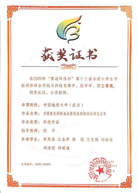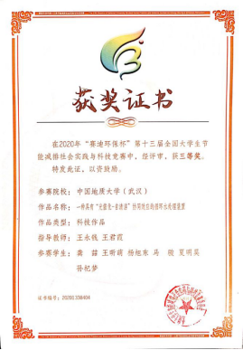 段平老师指导的李茂森学生团队的“多固废协同制备地聚物低碳胶凝材料及应用”作品,王永钱、王君霞老师指导的龚喆学生团队的“一种具有“光催化-自清洁”协同效应的循环水处理装置“作品,均荣获三等奖。