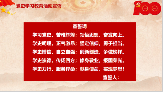 学院化学系本科生第二党支部书记魏梦贞作为领誓人带领与会全体同志进行党史学习教育活动宣誓,誓词慷慨激昂,声音铿锵有力。