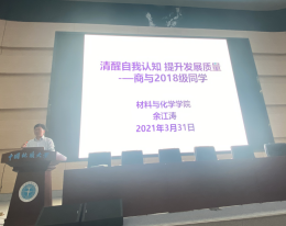 3月31日晚18:30,材化学院本科生2018级交流指导发展会在地理信工学院报告厅举行,学院党委副书记余江涛、辅导员唐伟参加会议,同时邀请到学院保卫处未来城校区保卫办公室主任周日恒、学生心理健康教育中心黄海、研究生徐磊、聂涛分别作有关安全、心理、考研、求职的专题辅导。2018级全体本科生参加大会,辅导员唐伟主持会议。