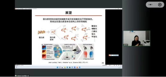 娄老师结合自身的科研经历向同学们分享了她的成长故事,同时针对活细胞蛋白质分析的相关领域做了重点介绍,蛋白质的存在、蛋白质的检测及应用、检测面临的挑战,以及娄老师、课题组、合作者开发一系列模块化多肽探针,提升探针入胞效率,增强识别特异性,提高检测信噪比,实现活细胞复杂环境中蛋白质的精准识别与动态分析所做的卓越工作。在最后的展望中,娄老师提出“不是所有的蛋白质分子都会参与疾病的发生和发展,其中特定的蛋白质存在形式才是疾病发生发展的关键。今年发表在Science上的一项最新研究公布了人类血细胞“蛋白质变体”图谱,并进一步研究了其重要的临床应用价值,这标志着对蛋白质进行更精确研究的新时代的来临。模块化多肽探针可以尝试应对这一挑战”