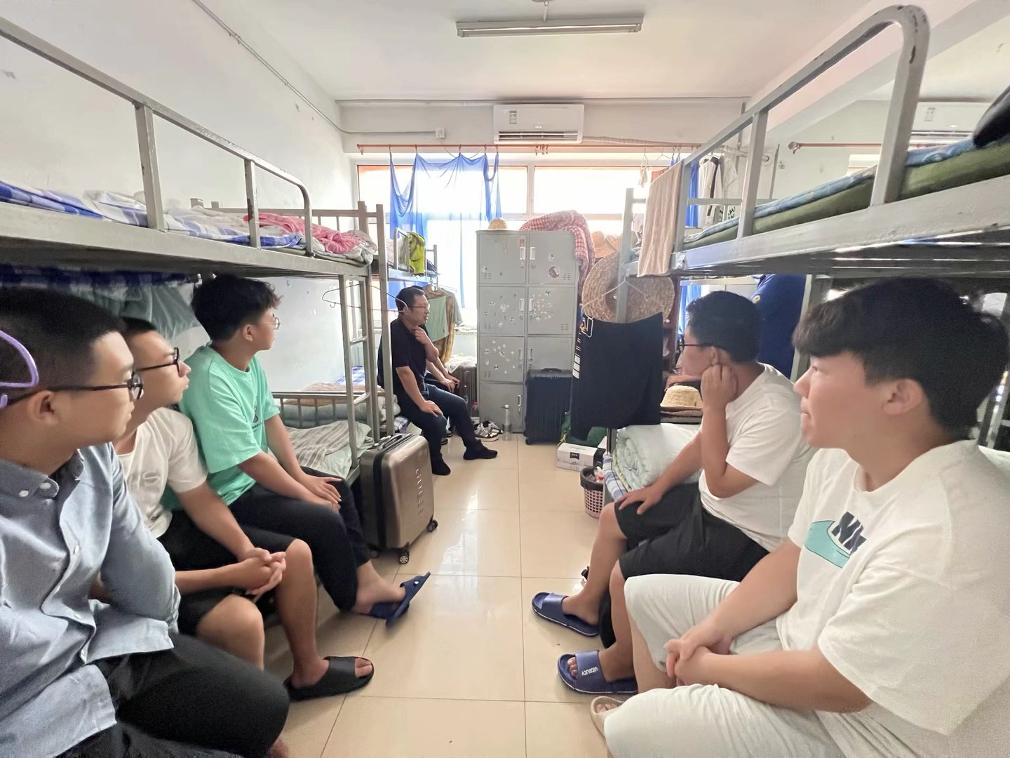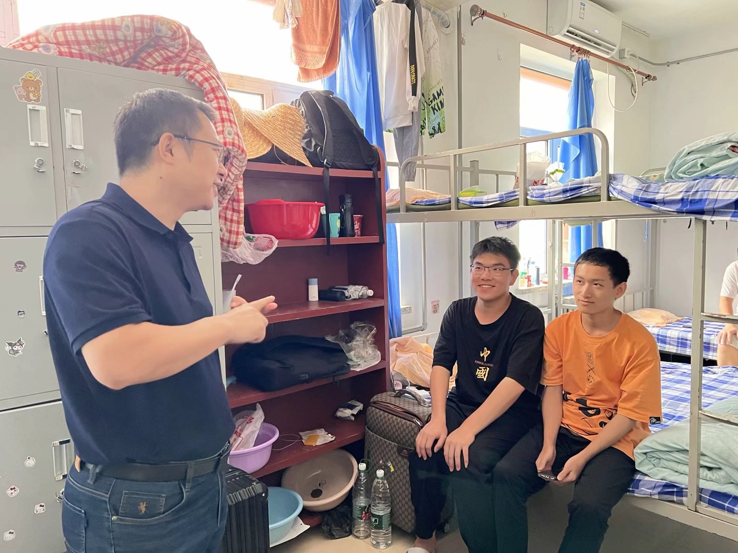 野外实习结束后,梁本哲书记来到实习基地学生宿舍与学生座谈并向同学们发放慰问物资。梁本哲坐在同学们的床铺上与同学们促膝长谈,向同学们亲切问候,并详细询问了在站学习、生活情况。