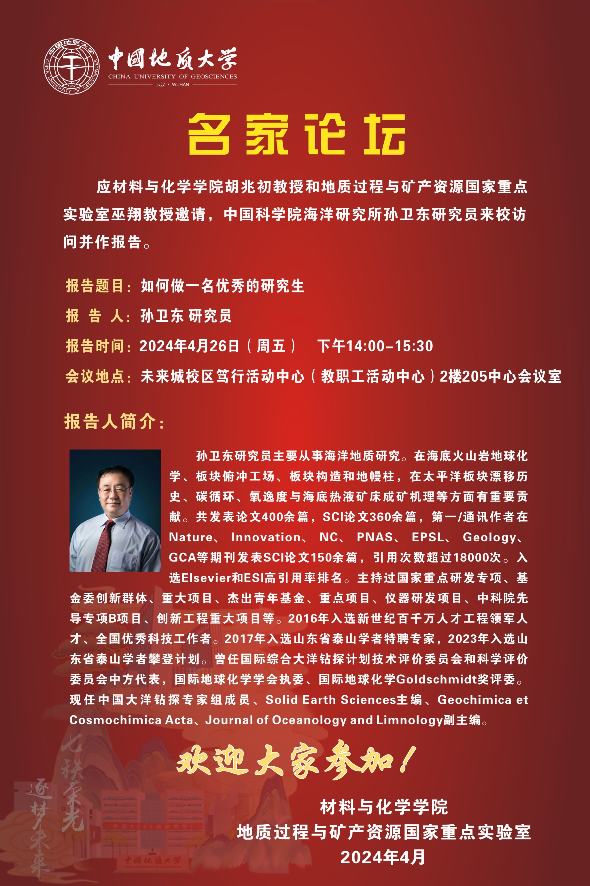 应中文字幕av 及地质过程与矿产资源国家重点实验室邀请,国家自然科学二等奖、安徽省科学技术一等奖获得者,中科院海洋研究所孙卫东研究员将与中文字幕av 师生交流并讲座。
