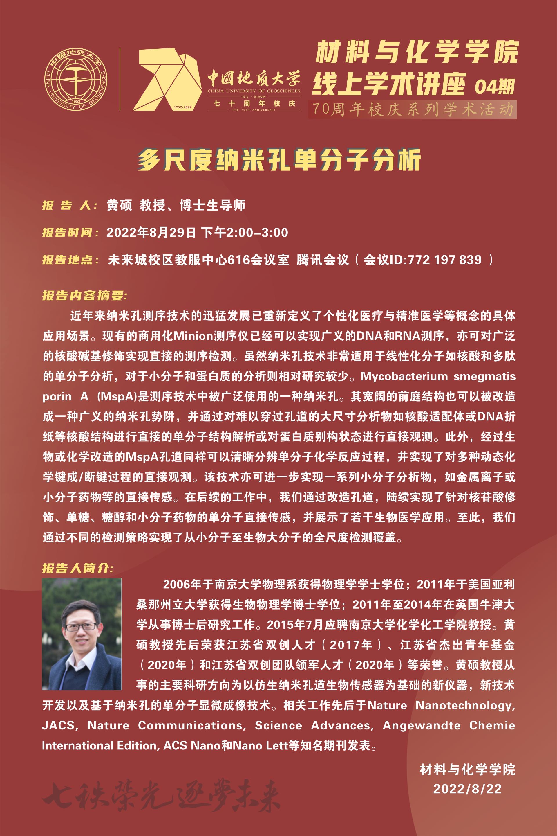 应中文字幕av 邀请,南京大学化学化工学院黄硕教授将与师生交流并讲座。