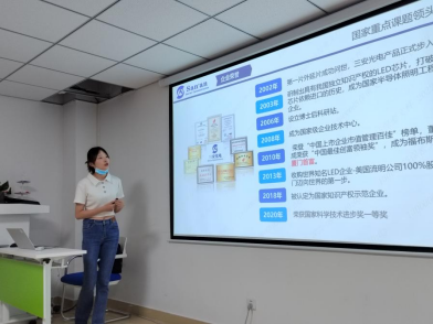 紧接着人力资源部同志向同学们介绍了三安光电的发展历程、主要产业和相关成就,同时还对湖北三安光电有限公司的厂区车间排布、员工生活以及校招岗位和薪资福利进行了介绍。之后的一个小时,公司培训主管给同学们详细地介绍了 LED芯片制作的工艺流程,利用A4纸裁剪的模型生动形象地模拟生产流程。材化师生认真聆听工作人员的讲解,并进行了深入交流讨论,收获颇丰。