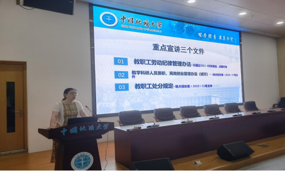 黄菊书记首先解读了《教职工劳动纪律管理办法》《教学科研人员兼职、离岗创业管理办法(试行)》《教职工处分规定》等几个学校教职工日常管理的制度文件,并重点宣讲了教育部通报的违反高校教师职业行为十项准则的十一个典型案例。要求全体教师严格要求自己,爱岗敬业,增强作为一名教师的责任感、使命感、荣誉感,规范职业行为,明确师德底线,真正成为新时代的有理想信念、有道德情操、有扎实学识、有仁爱之心的“四有”好教师。