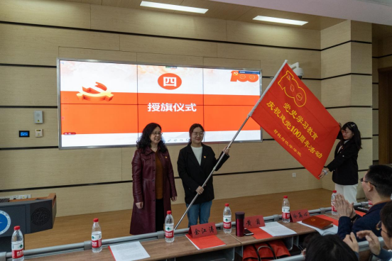 学院党委书记黄菊向学生代表授旗,学生代表庄重地接过了“党史学习教育 庆祝建党100周年活动”的大旗。