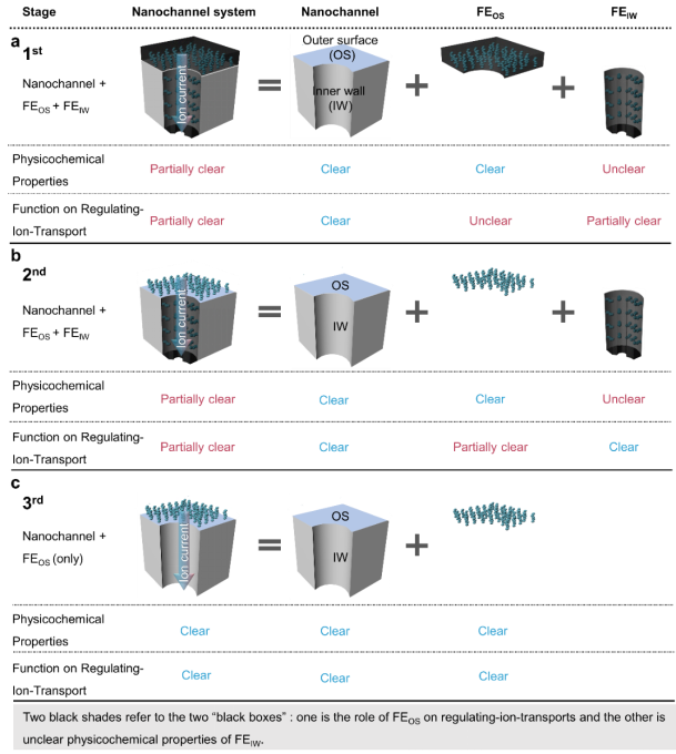 在前期工作中,由于纳米孔道的“空间限域”效应,处于纳米限域空间的孔道的内表面得到广泛关注。但由于空间限域,多数测试技术无法精准检测孔道内表面的物理化学性质,孔道内表面功能分子物理化学性质难以表征,其对离子输运的调控机制尚不明确,这极大限制了纳米孔道的应用。