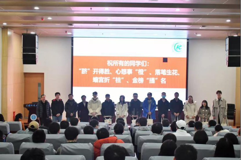 最后,出席大会的领导、老师为各班考研同学代表送出学院精心准备的考研冲刺包:一个装有脐橙、笔和桂花糕的手提袋,预祝同学们都能“脐”开得胜、心想事“橙”、落笔生花、蟾宫折“桂”、金榜“提”名。