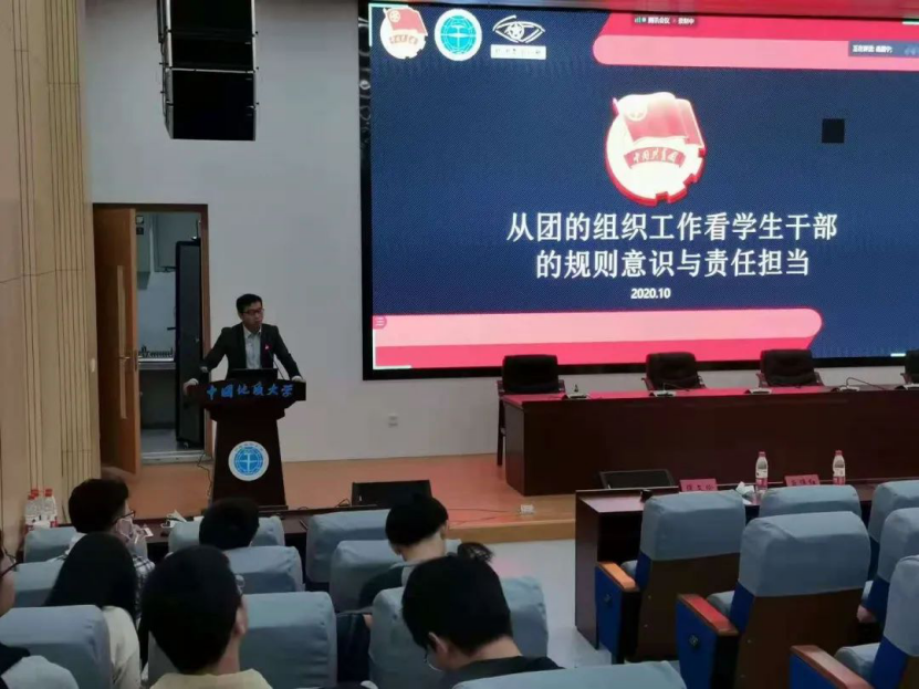 10月24日,校团委副书记谭文伦老师以“从团的组织工作看学生干部的规则意识与责任担当”为主题,结合当前校团委的主要工作,向学生骨干们介绍了身为一名学生骨干应有的责任与担当。谭老师从培训模式、培训效果出发,向同学们阐述了新生骨干培训的重大意义,并告诫学生骨干:务实不懈怠,学习无止境,创新高站位,谦逊永躬行。