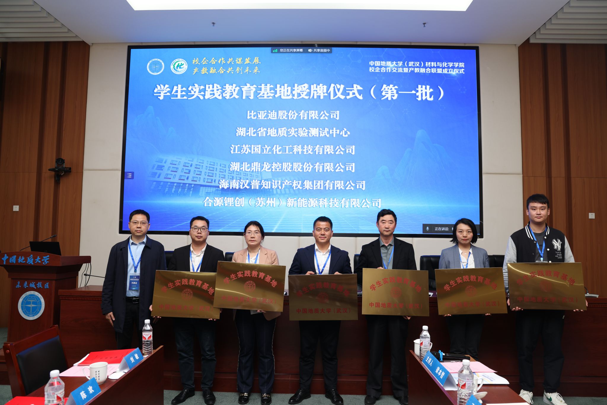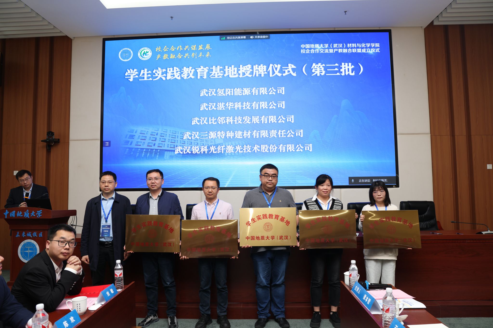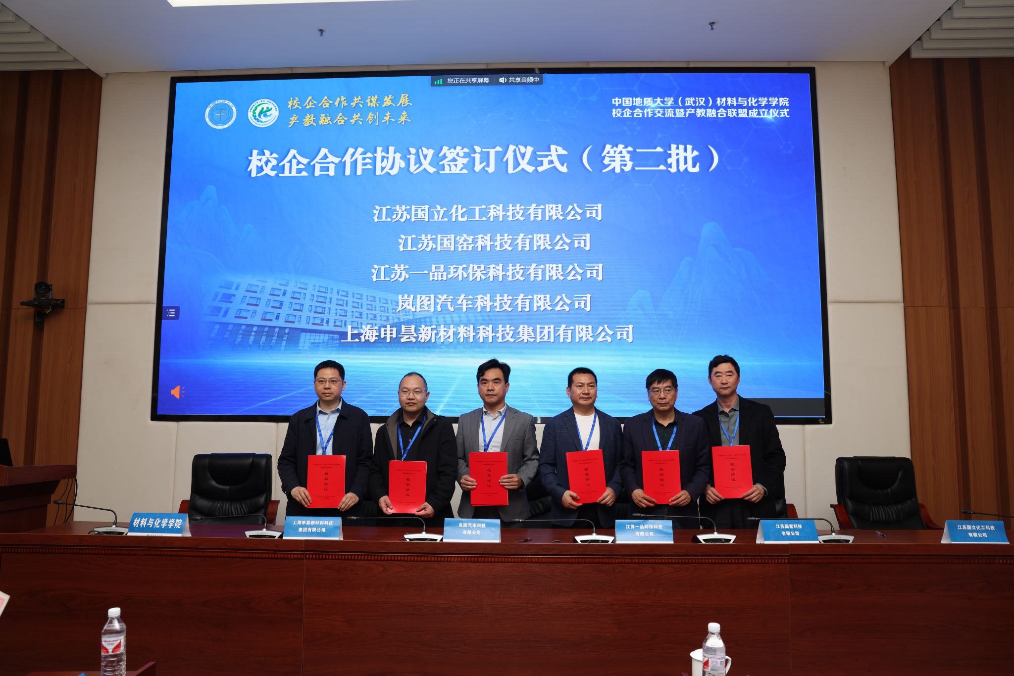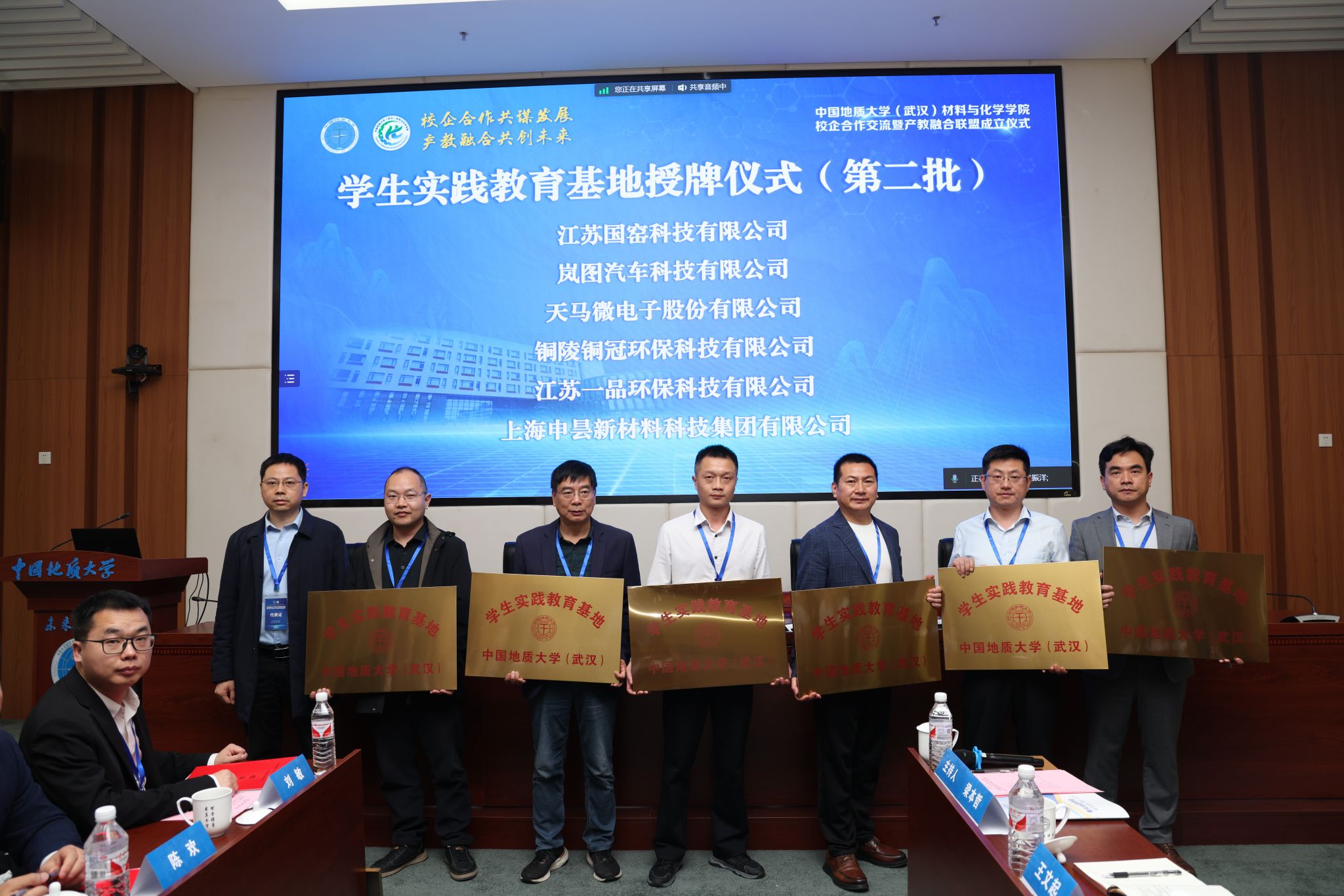 材化学院党委书记梁本哲与10家企业代表签署党建联建共创协议。胡兆初与19家企业代表签署校企合作协议,并为23家企业授学生实践教育基地铜牌。