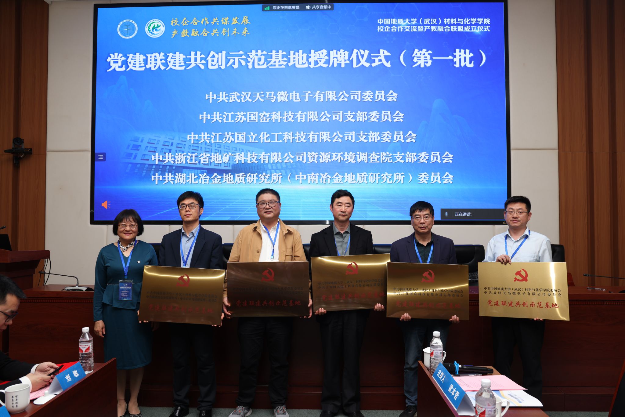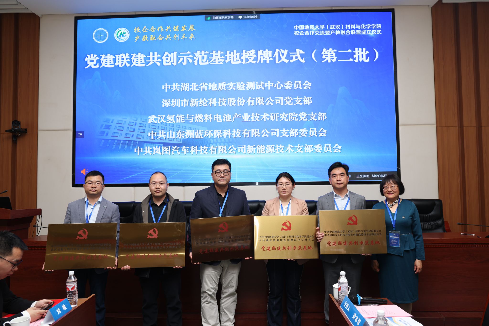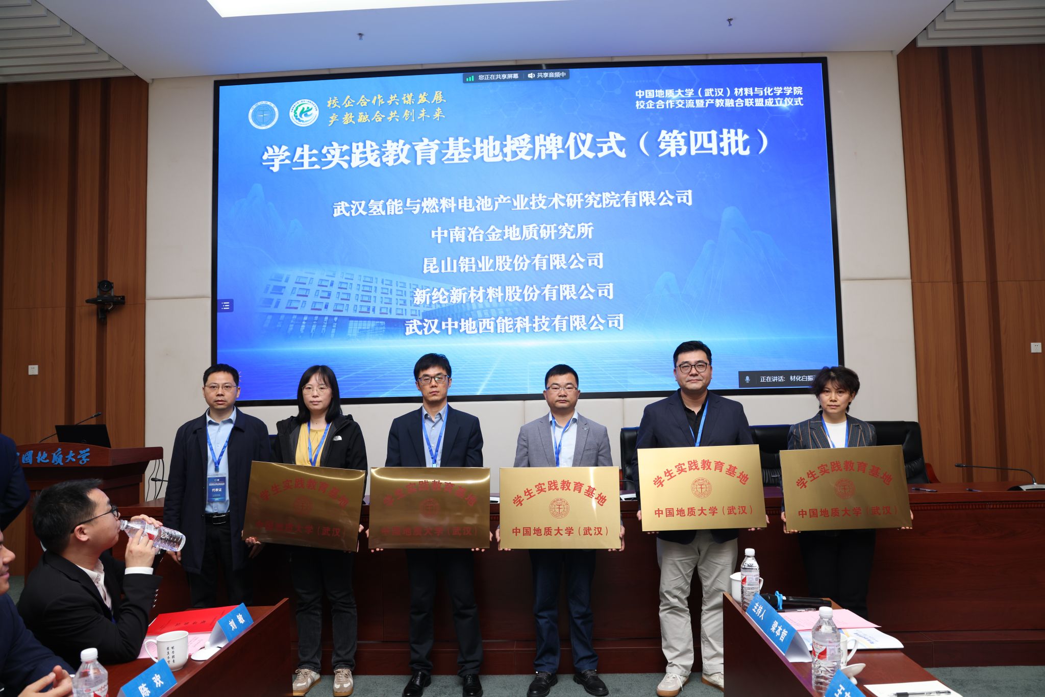 材化学院党委书记梁本哲与10家企业代表签署党建联建共创协议。胡兆初与19家企业代表签署校企合作协议,并为23家企业授学生实践教育基地铜牌。