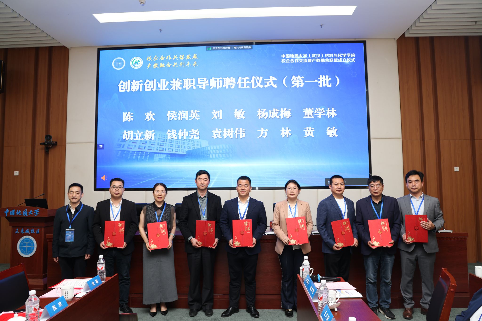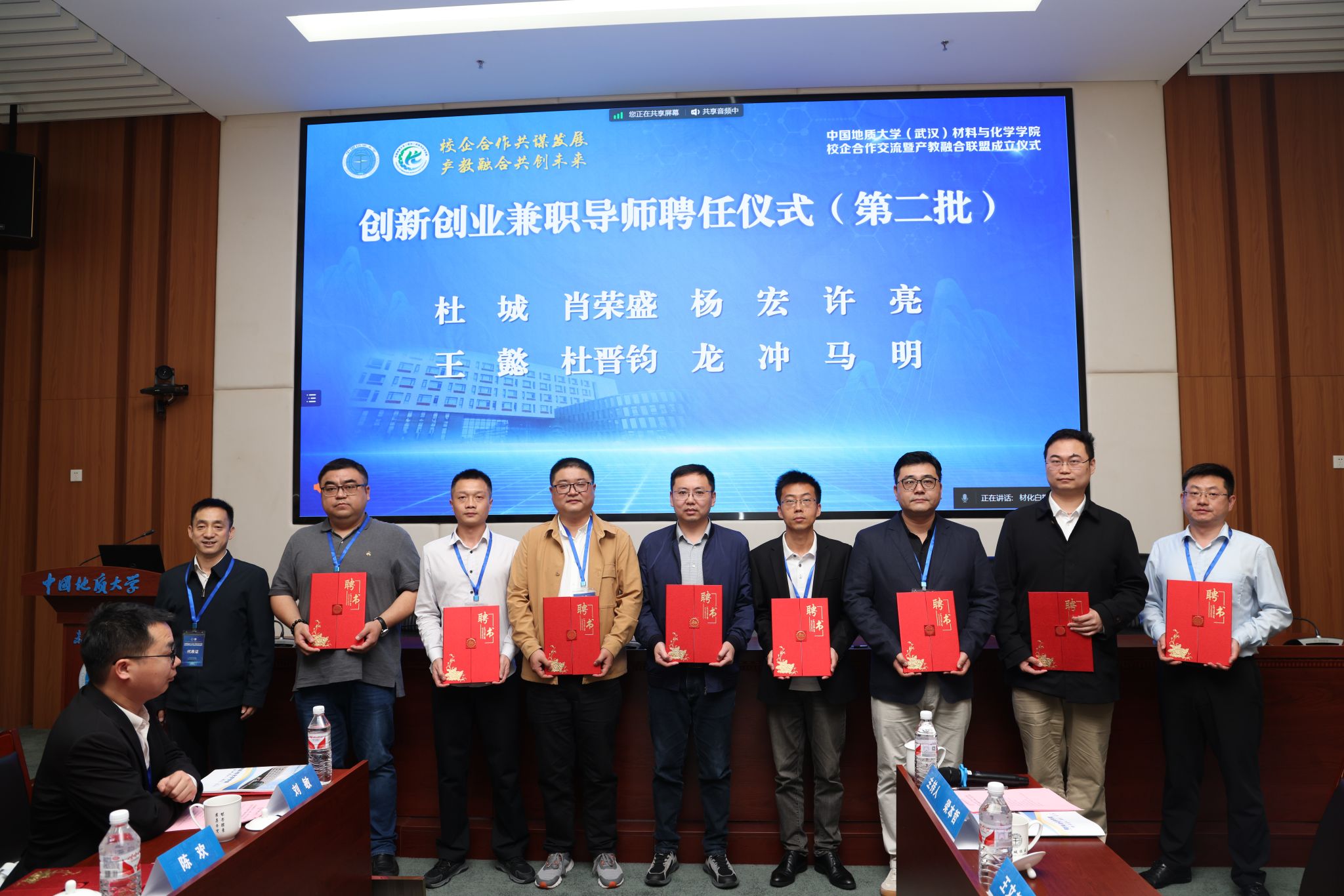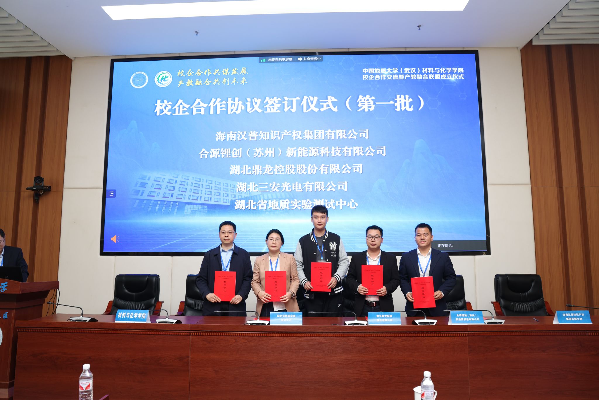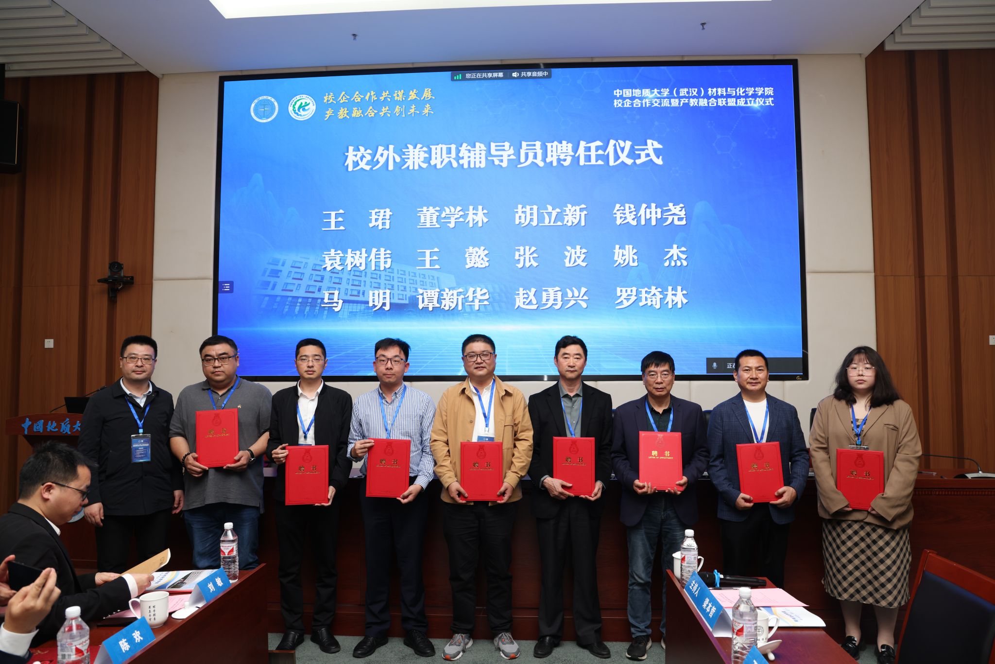 材化学院党委书记梁本哲与10家企业代表签署党建联建共创协议。胡兆初与19家企业代表签署校企合作协议,并为23家企业授学生实践教育基地铜牌。