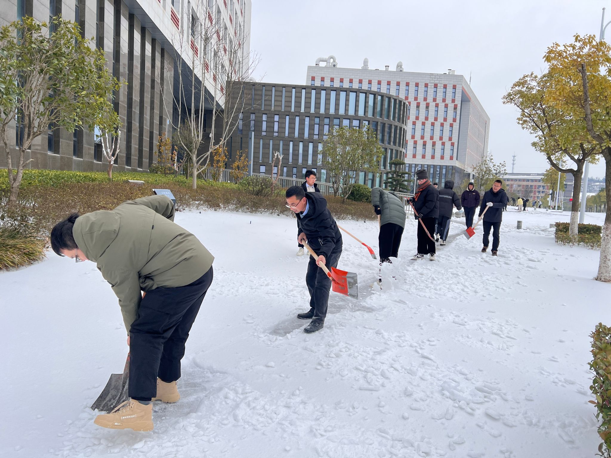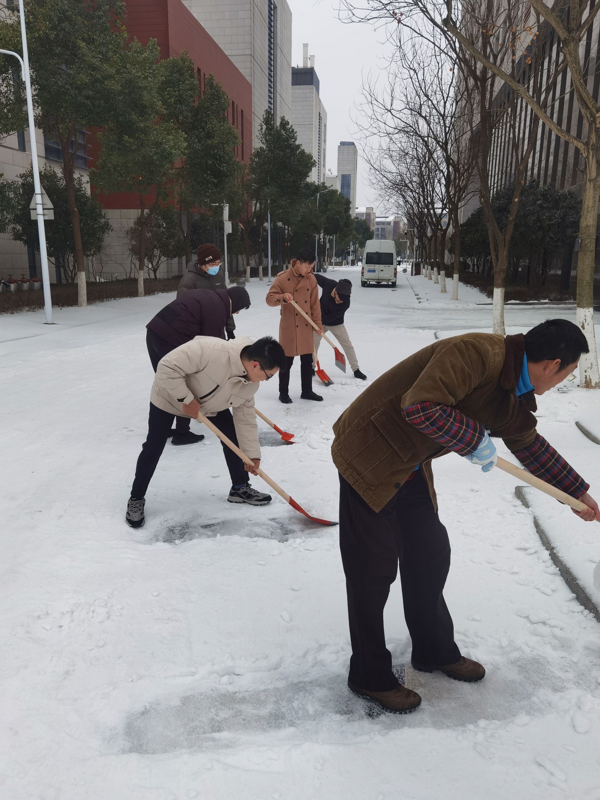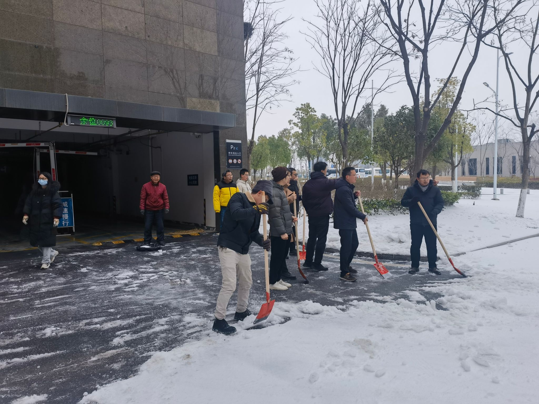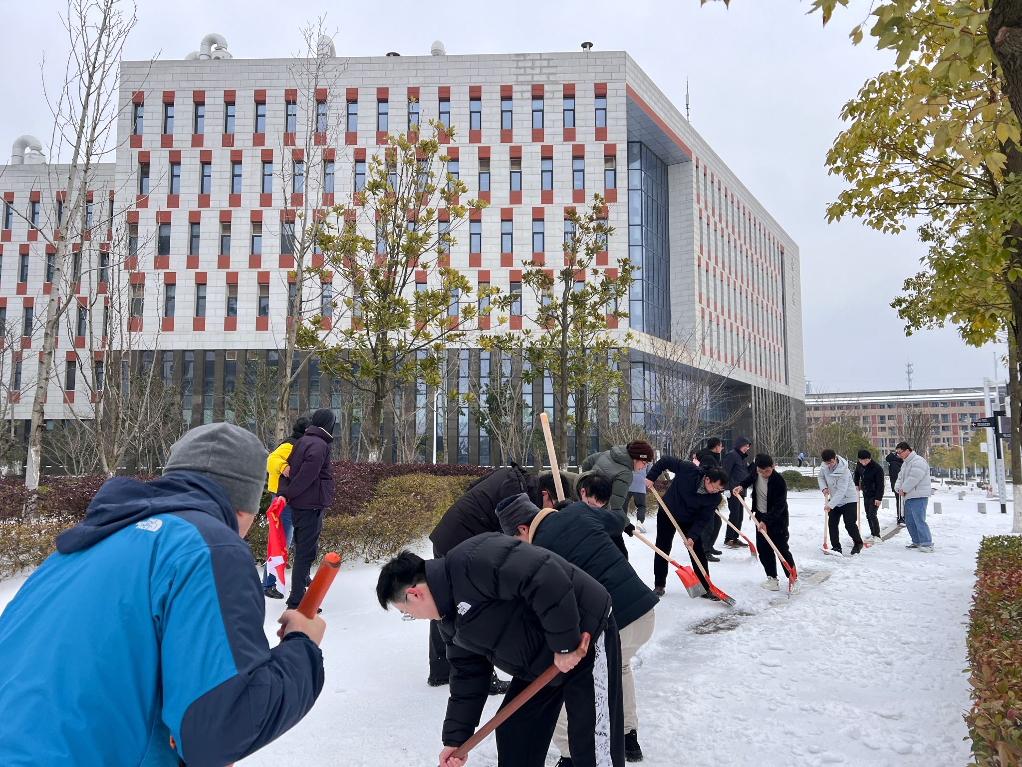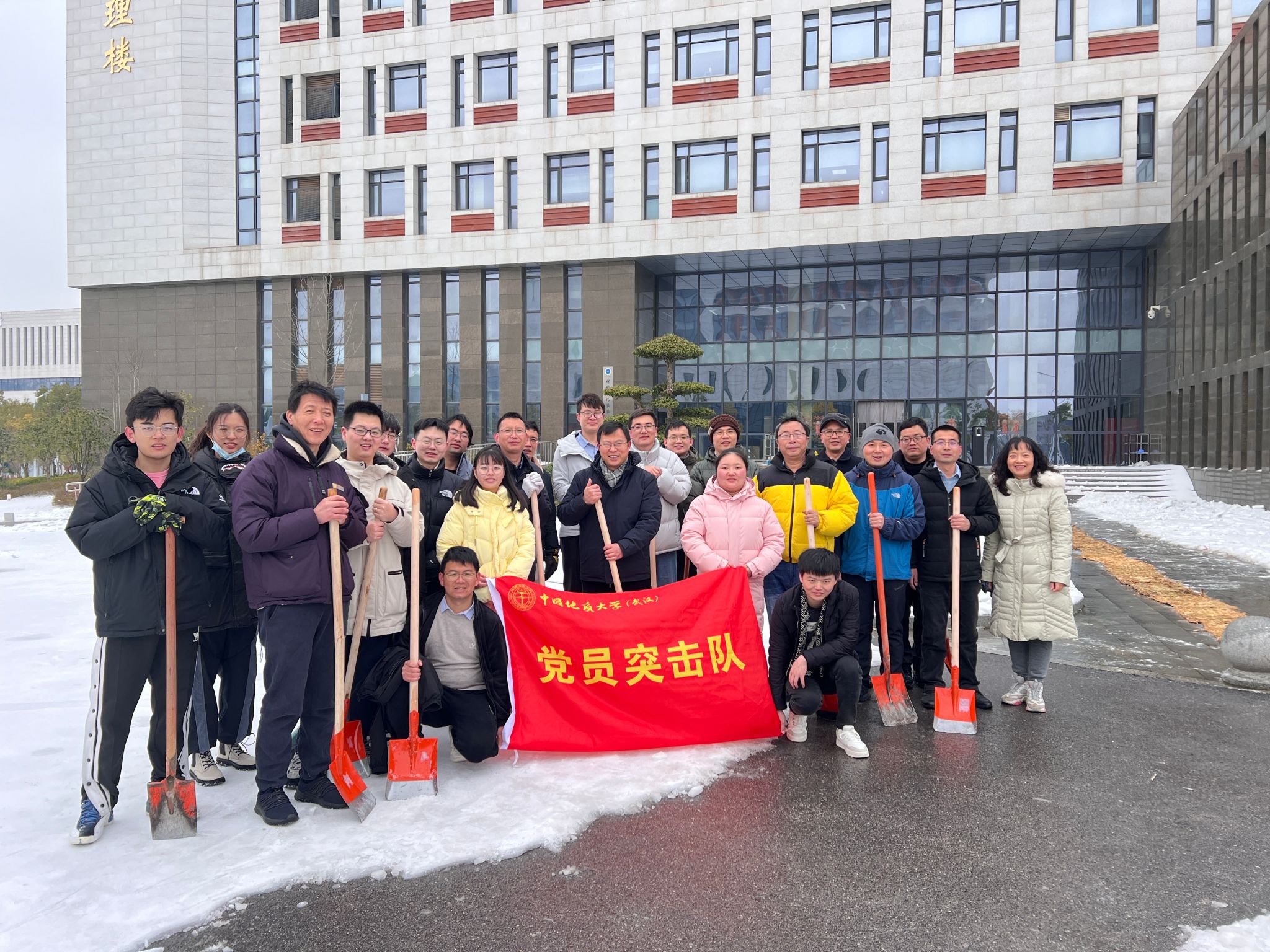连日来,武汉市低温雨雪冰冻天气造成校园路面积雪结冰,存在安全隐患。为保障师生出行安全通畅,为同学们返校营造良好的环境,学院积极响应学校号召和部署要求,成立师生党员应急突击队。